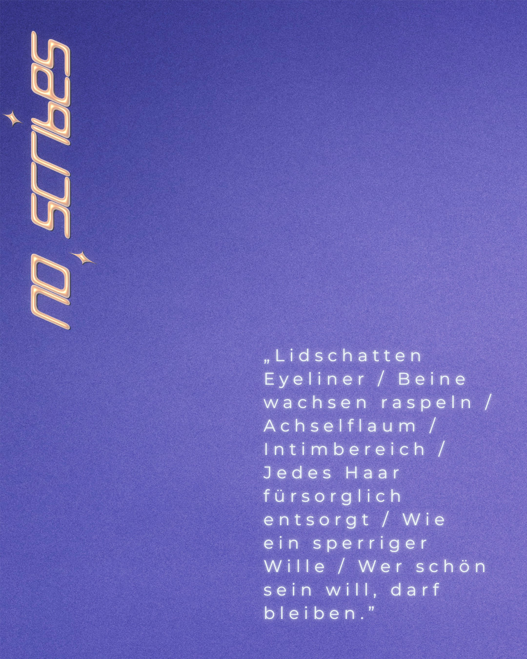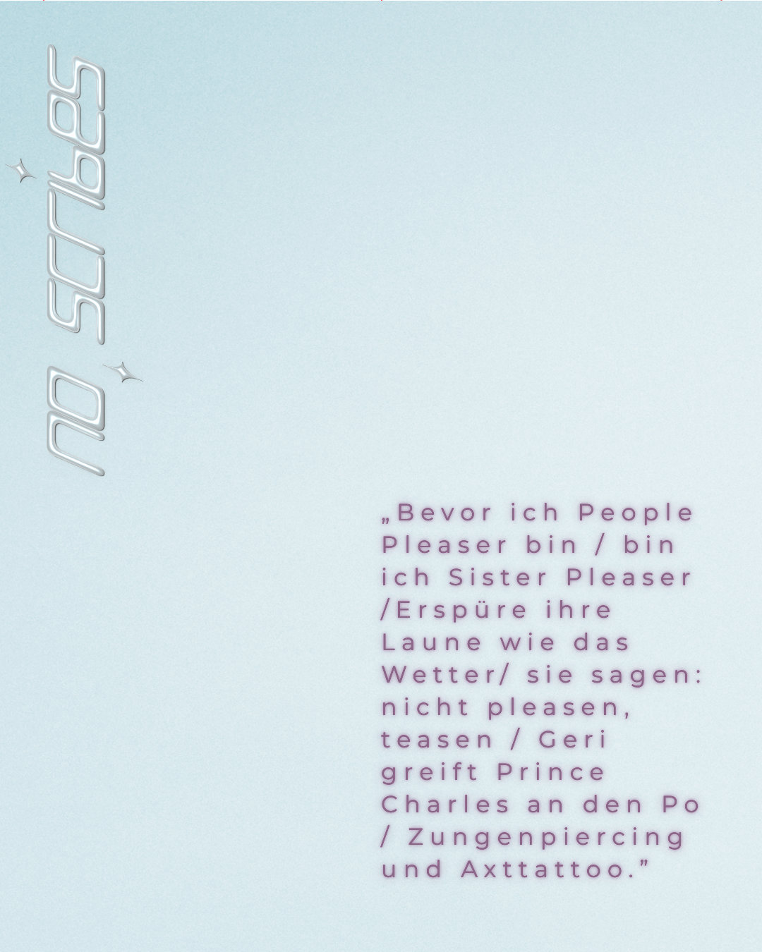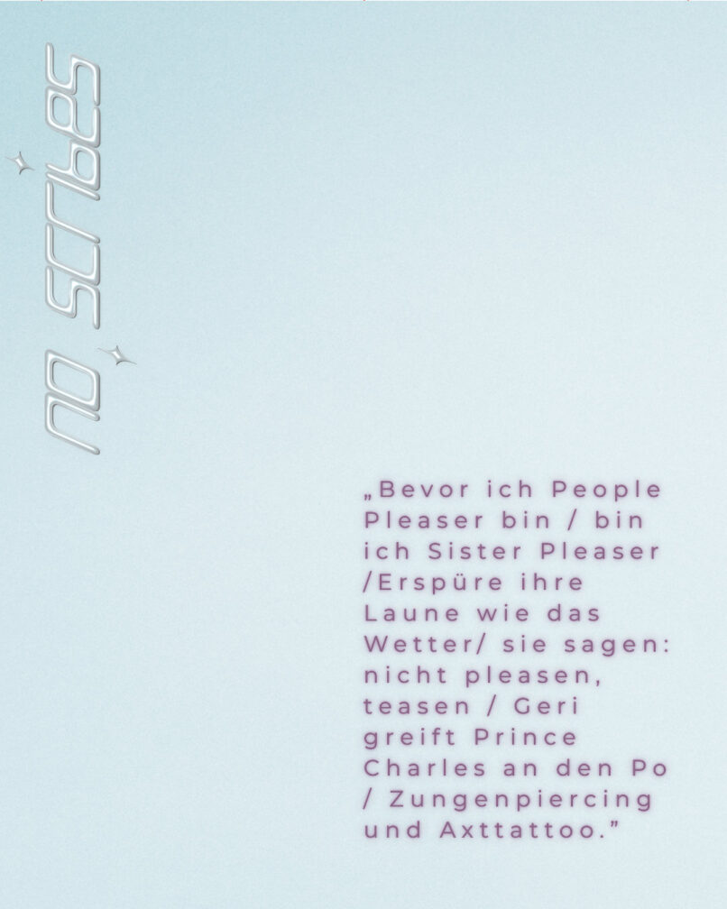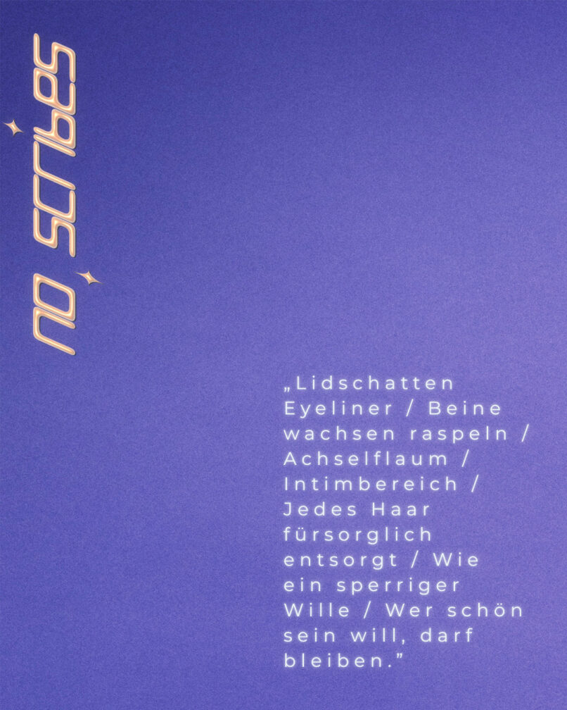 Drei Autorinnen gründen eine Girlband im Stil der 90er: NO SCRIBES. In einer literarischen Show, inszeniert von Regisseurin Lena Brasch, thematisieren sie Identität und Klassenzugehörigkeit, Girlhood und (Pop-)Feminismus.